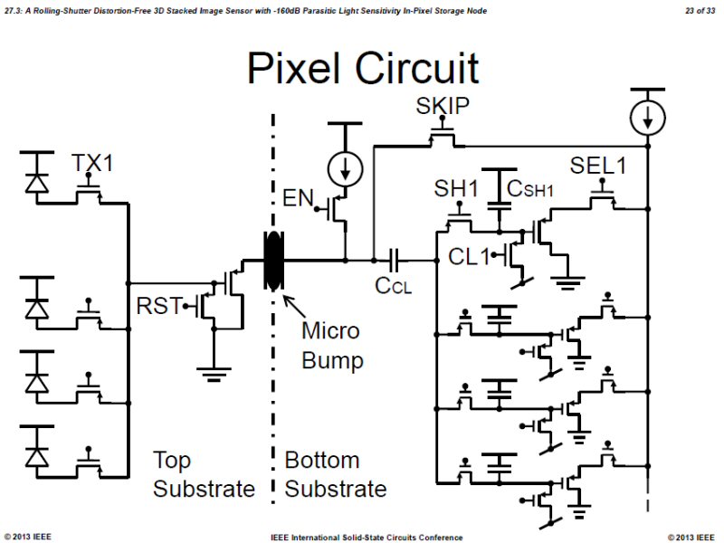 ↑ 「画素部の等価回路図です。4画素でFDやSF、リセットトランジスタを共有しています。top基板側にフォトダイオードと転送、リセット、SFトランジスタ、及びFD部を配置。bottom基板側にグローバルシャッタ動作に必要な一時電荷保持容量部を作りこみました。上下の基板のつなぎ目は画素ソースフォロワの出力ノードをマイクロバンプでつないでいます。」