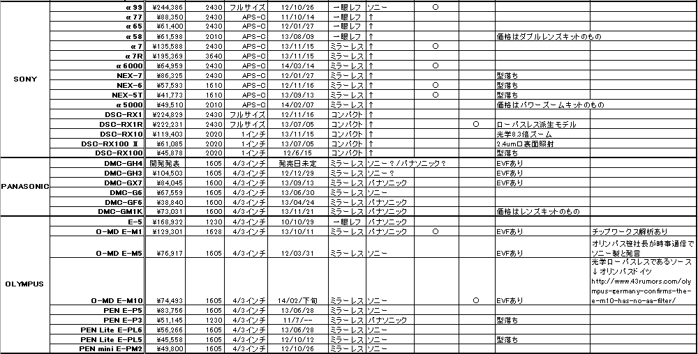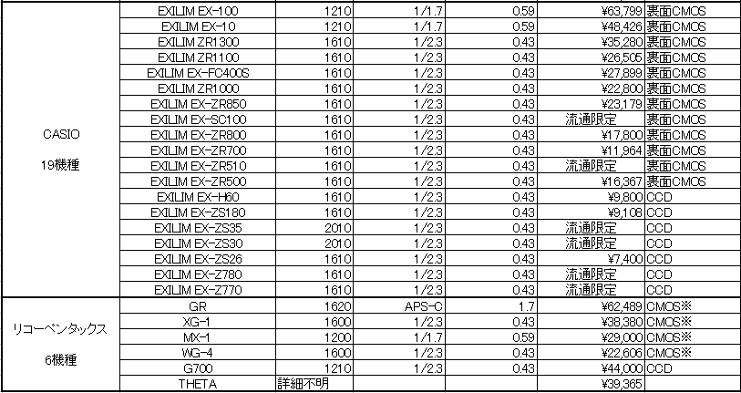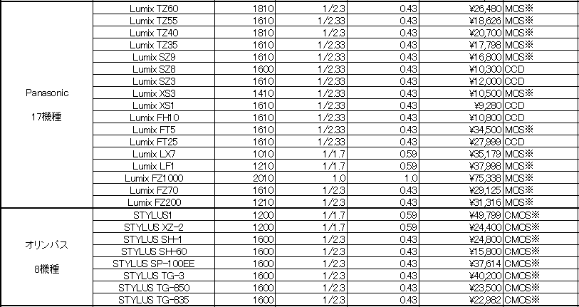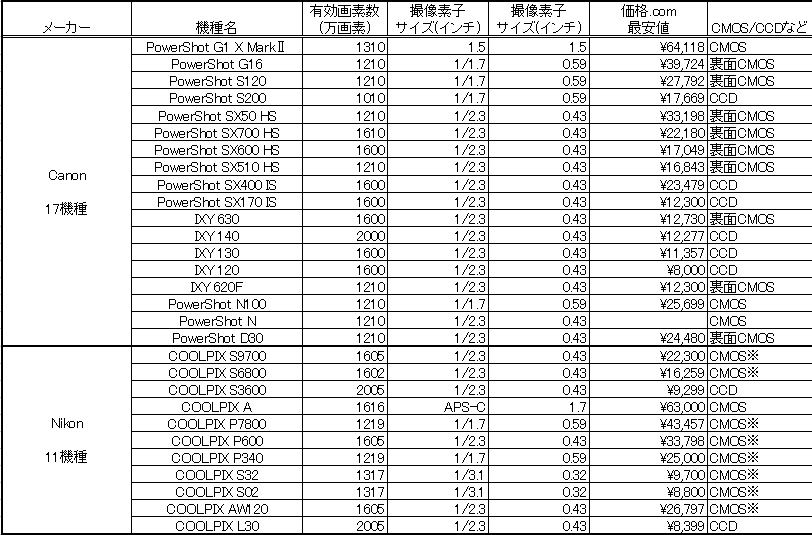また、その他一緒に調べた、機種名、搭載撮像素子の画素数及びサイズ、CCD/CMOSセンサの別、価格.comの最安値の一覧を参考までに以下貼り付けます。