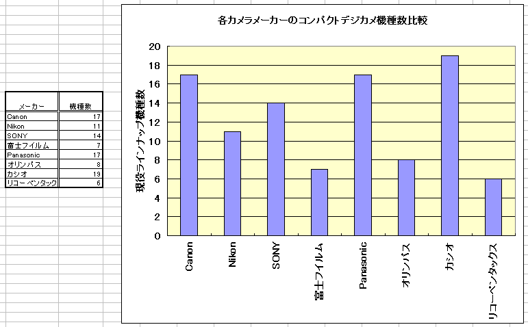 ↑ 各カメラメーカーのコンパクトデジタルカメラの現役ラインナップ機種数比較