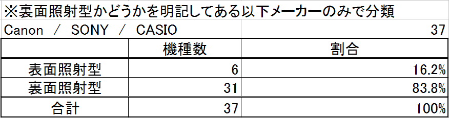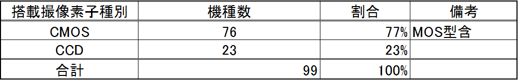 良く見ると、使っている撮像素子の種類が、これだけのカメラの機種数にも関わらず、たったの4種しかないことがわかります。