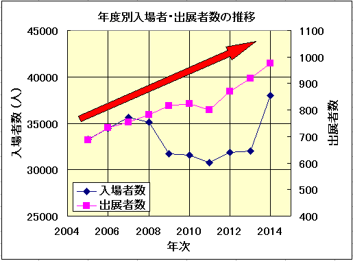 入場者数の方は例によってリーマンショックの影響か、2009年に一度減って、その後低値安定でしたが、今年急増して過去最高の入場者数を記録。出展者数の方は順調に(?)増加し続け、1000社に迫ろうかという勢いです。