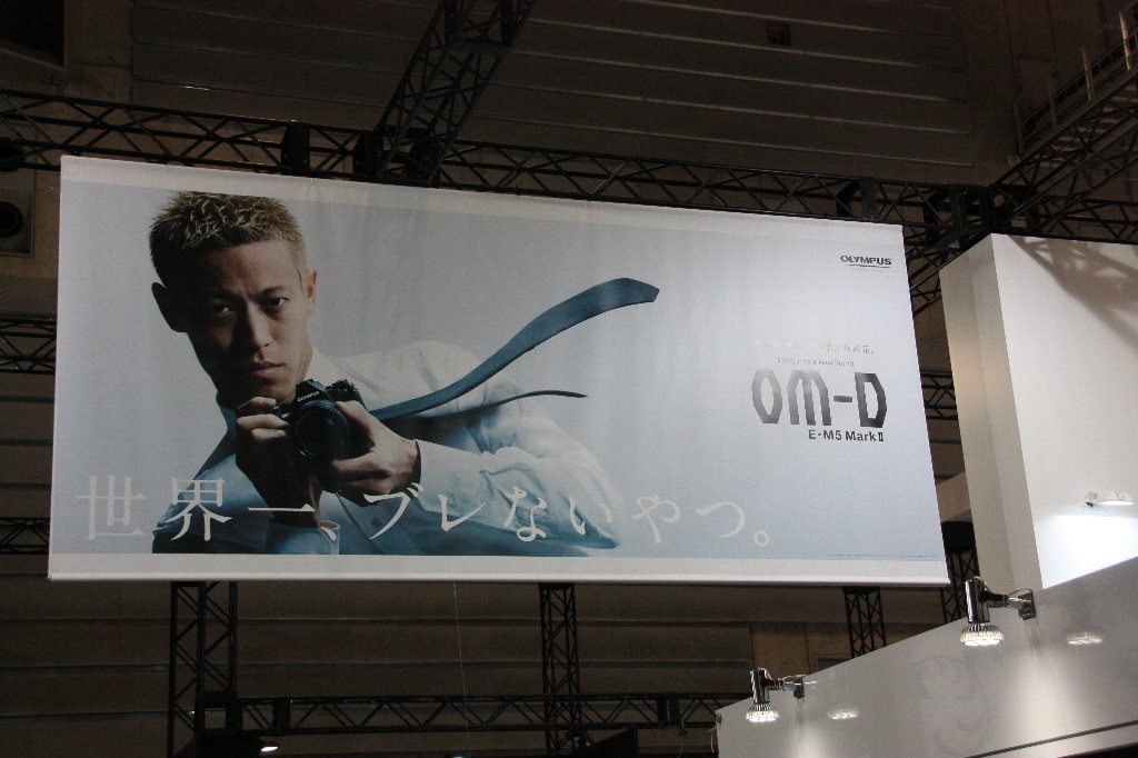 ↑オリンパスも手振れ補正能力のアピールに、本田圭佑を採用しての”世界一、ブレないやつ。”のキャッチフレーズでアピール。