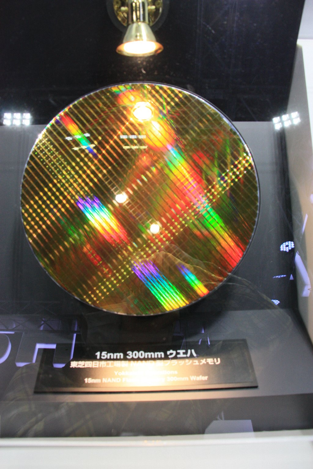 ↑東芝ブースに置いてあった、これは撮像素子では無く、15nmプロセスで300mmΦウェハに製造されたNANDフラッシュメモリ