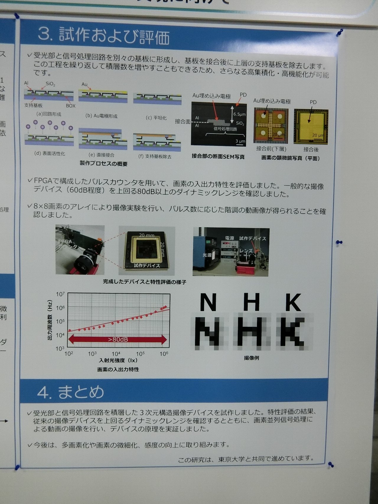 あとは、上の写真の”まとめ”にも書いてある通り、(パルス変調の様な画素AD回路にしたお陰で)80dBのダイナミックレンジ(従来センサだとNHK曰く60dBのところを10倍のダイナミックレンジ拡張に成功)を確認できたことだとか。