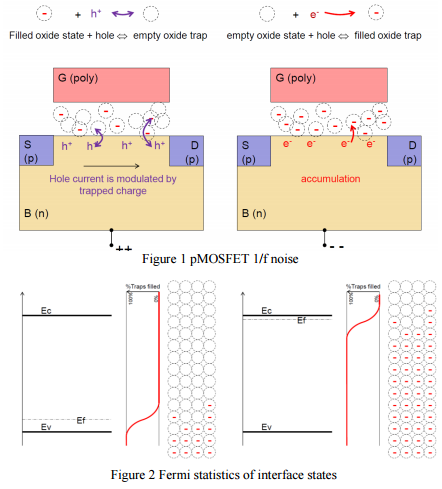 はたまた全く逆で、Accumulation時に界面トラップが電子でほぼ埋まるため、キャリアであるホールがinversion時にほとんどトラップされなくなるので1/f的な揺らぎがなくなる・・・と言っているのか、それともそのどちらでも無いのか・・・