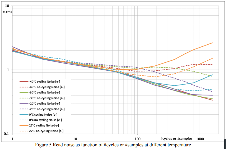 また、よくよく見ると、常温でサンプリング回数1回・・・つまり通常使用時で、特殊な動かし方は何もしていない素の(このセンサの)読み出しノイズの実力は、約2e-rms。