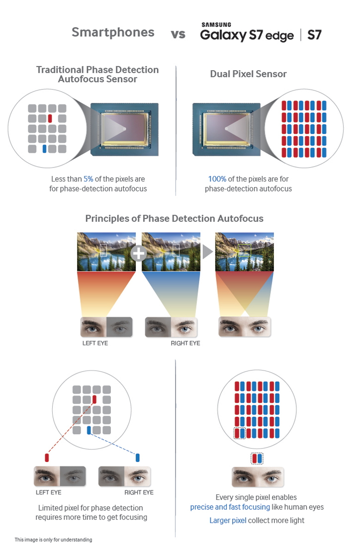 (”画素ピッチを1.4um□にして画素数も16Mを維持する”という選択肢もあり得ますが、恐らく有効画素領域が大きくなると、レンズの光学系の厚みが増し、GalaxyS7の筐体厚みの中に納まりきらなくなり、この選択肢は最初から無かったのではと予想します。←コストの問題も加えて不利になると思われますので尚のこと・・・)