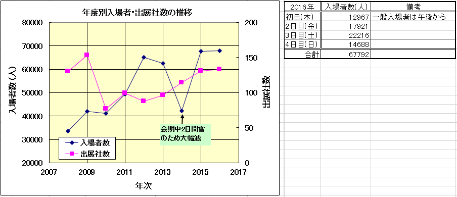 ↑2008年からの入場者数と出展社数の推移