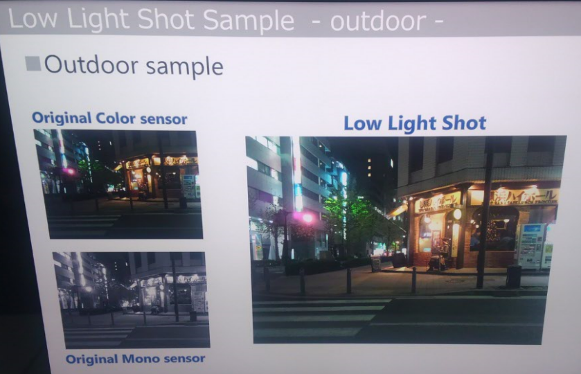 ↑カラーとモノクロの2眼(双眼?)カメラ搭載機で、双方を合成することによって(モノクロセンサの輝度情報を用いることによって)特に低照度領域での高感度化処理