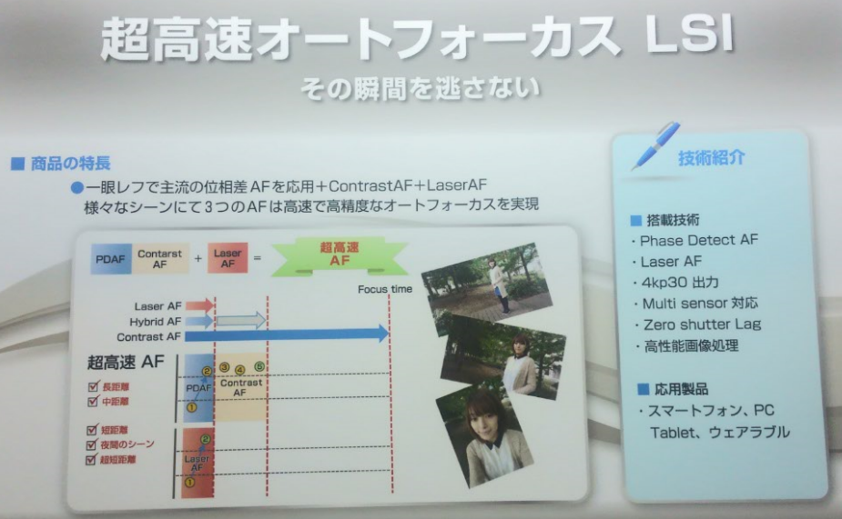 ↑像面位相差AF、コントラストAF、そしてそれらに加えて”レーザーAF”(レーザー光を発してその対象物からの反射光を読み取って測距する方式)の結果も併せて処理可能とすることにより、