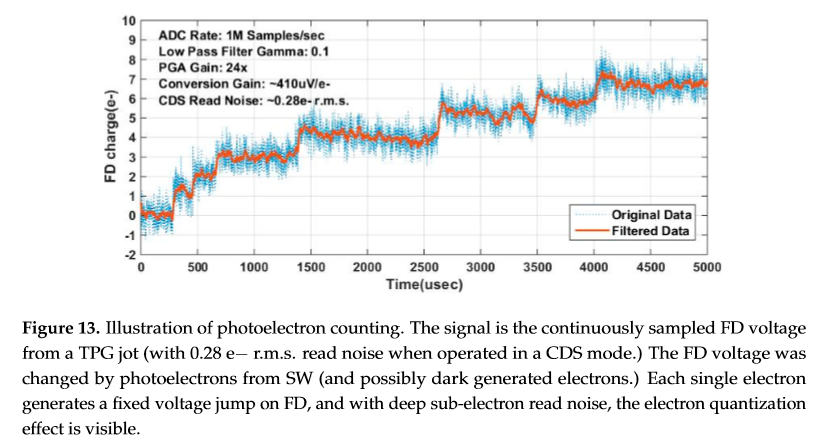 縦軸の一目盛りが1電子で、その値が”ステップ状に変化している”(←厳密にはoriginalデータを平滑化した後のオレンジ色の線において)ことから、少なくともこのjotにおいてはフォトンカウントが出来ていることを示している様です。