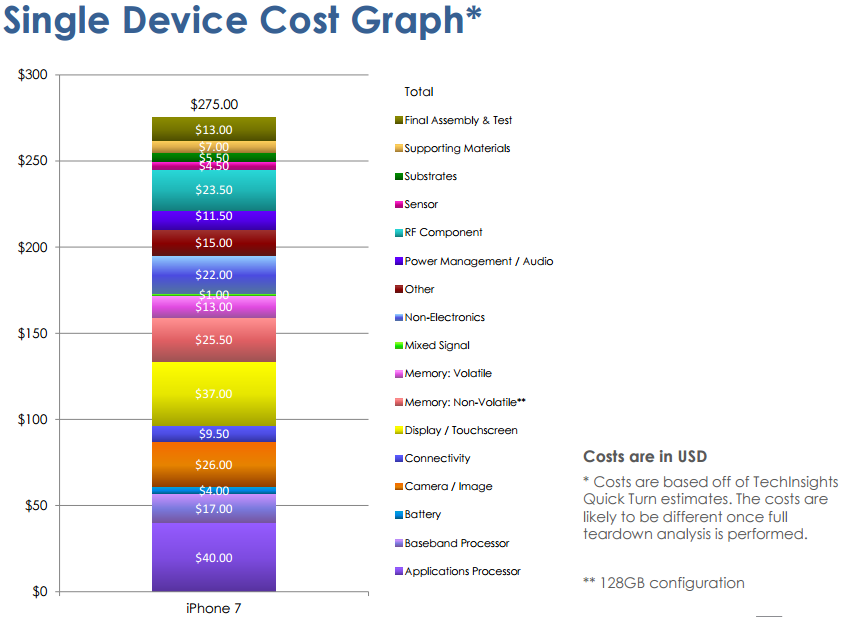 ↑128GBモデルのiPhone7ノーマルの、部品コストの内訳別積み上げ棒グラフ