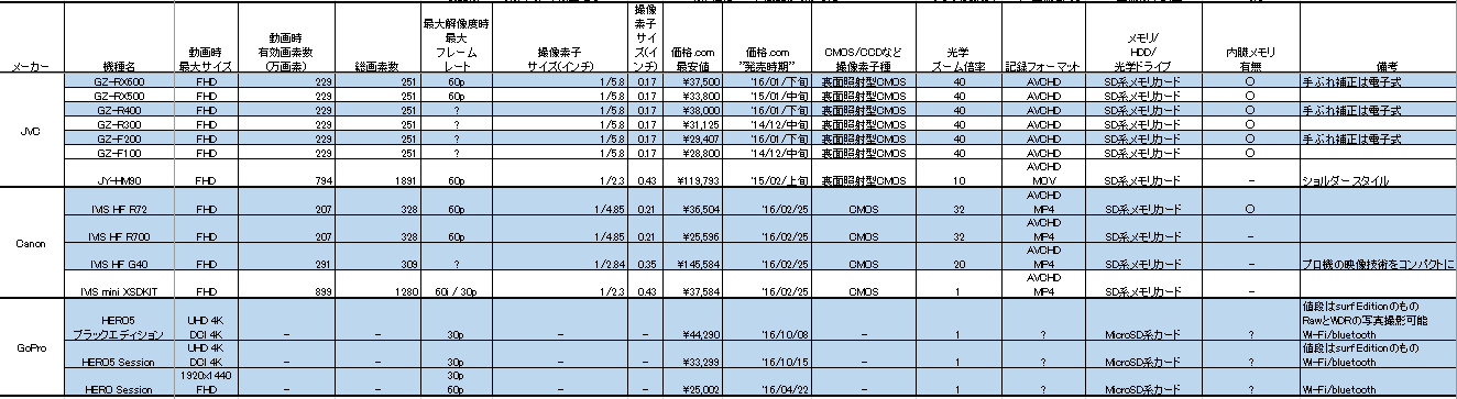 ・JVC全般の傾向として、耐衝撃、耐防水、耐防塵、耐寒冷(?)などに他社よりも力を入れている特徴がありそう
