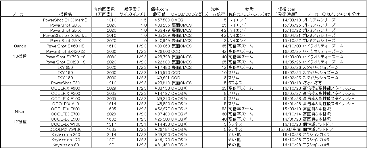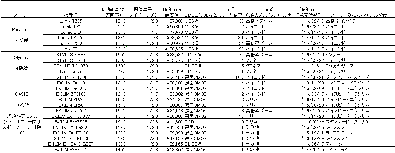 Canon、富士フイルム、パナソニック、オリンパスは順当に(?)コンデジの現役ラインナップ数は'14年から続けて漸減。