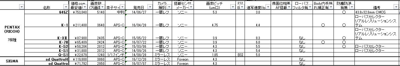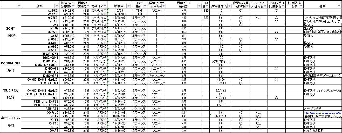 ※”搭載センサメーカー”欄のメーカーは私の予測も含めて書かれているだけですので、正しさは保証できません。ご了承願います