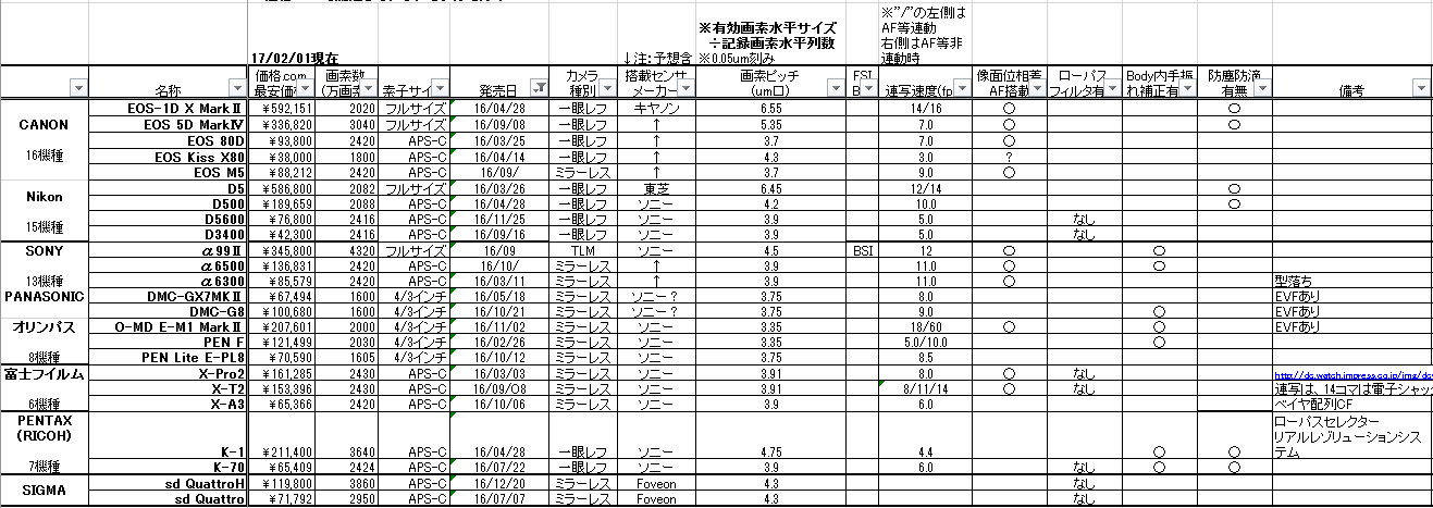 来週以降、もし興味とエネルギーが残っていれば、レンズ交換式デジカメ搭載撮像素子スペックの多少の傾向分析みたいなことはやってみるかもしれません。