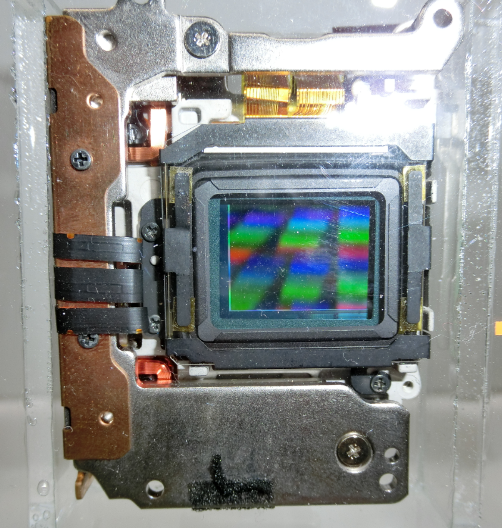 手振れ補正等のユニット込みの展示で、フィルター類もセンサ前面にどっちゃりついている状態ですので益々ヒントが少なくよくわかりません。