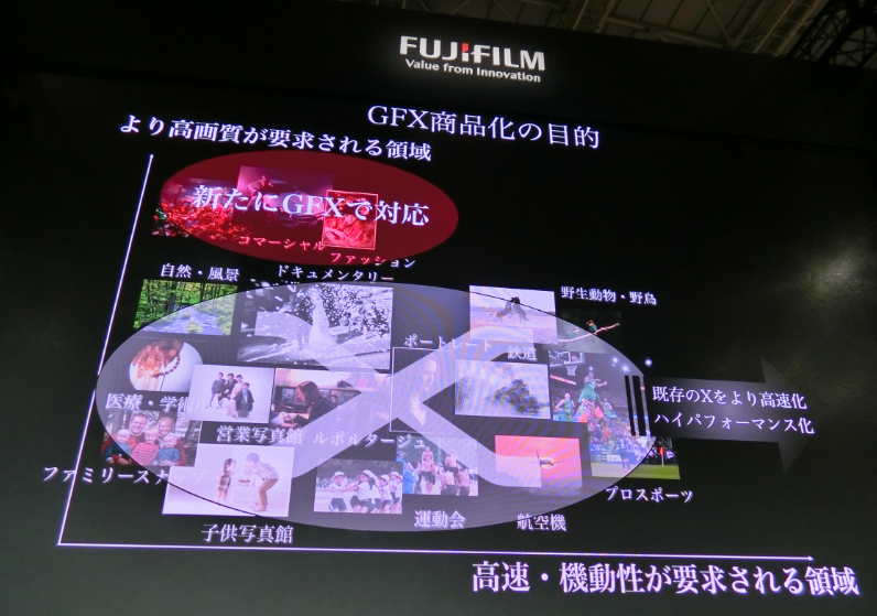 GFX(中判カメラ)商品化の目的は、コマーシャル、ファッションといった一部多画素(表現上は”高画質”となっていました)が必要となるジャンル(図中赤丸箇所)の方向けカメラ