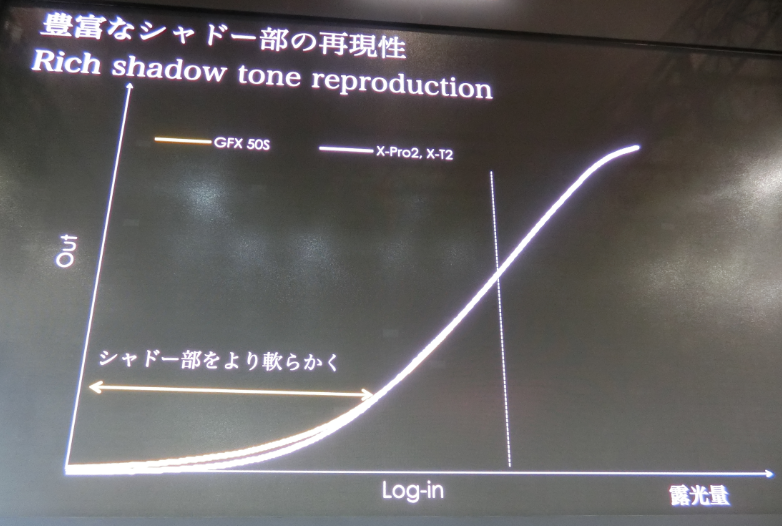 同じ富士フイルムのXシリーズカメラよりも、GFX50Sは、暗部を2/3段持ち上げる入出力カーブなのだとか。
