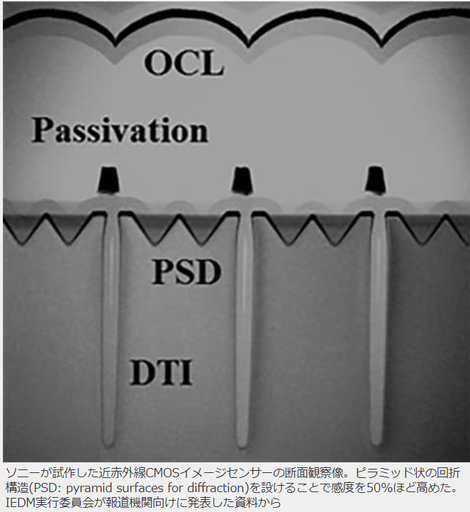 シリコン表面で入射光を回折させて、シリコン内での光線の光路長を稼ぎ、長波長の光でもフォトダイオードをなるべく透過してしまわない様にして赤外感度を高めるという。