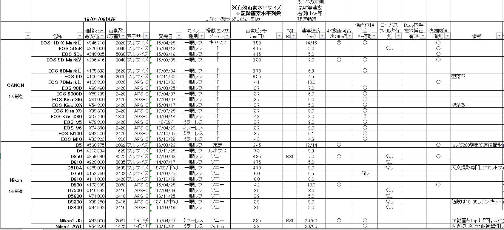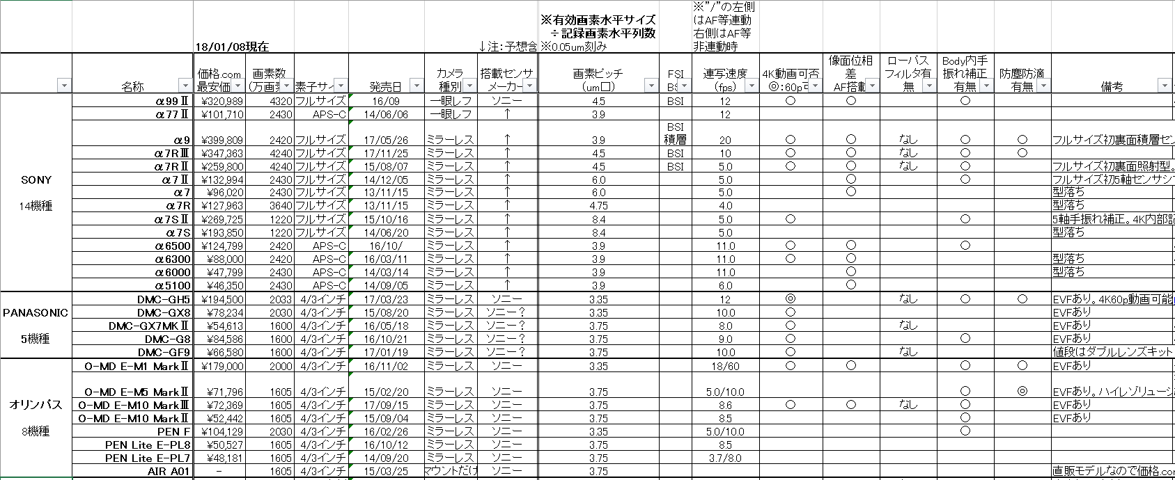 ※”搭載センサメーカー”欄のメーカーは私の予測も含めて書かれているだけですので、正しさは保証できません。ご了承願います