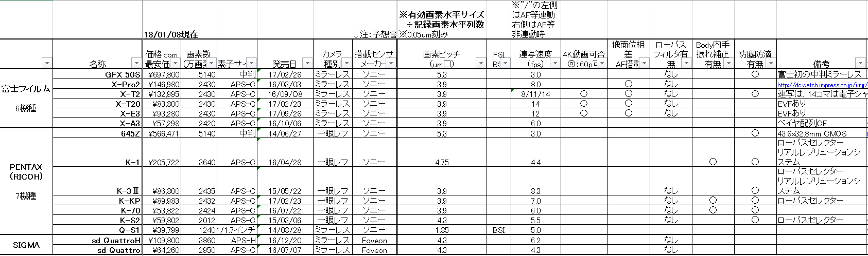 元来のペンタックス645Dや、今回のリストに無いMAMIYAやPhaseOneに加え、'17年に