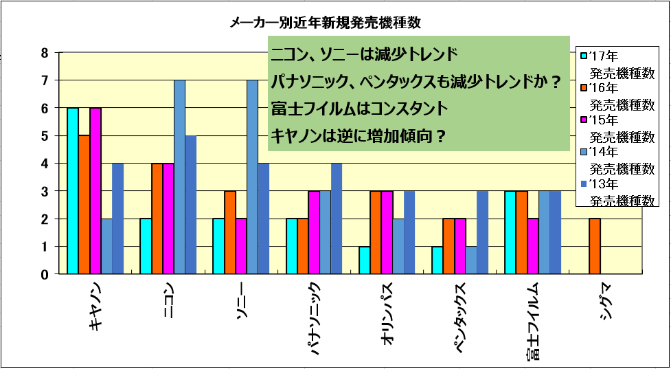 上図を見ると、各社とも、コンパクトデジカメ同様現役機種のラインナップ数に減少傾向は見受けられません。