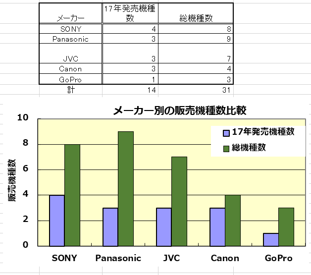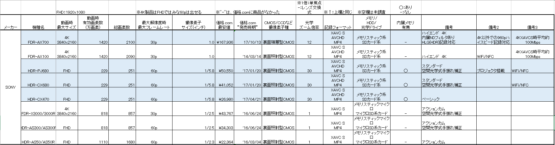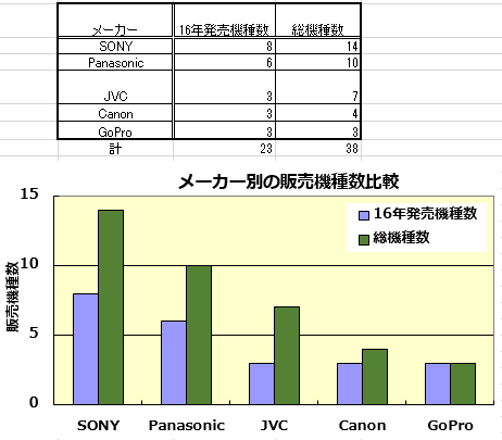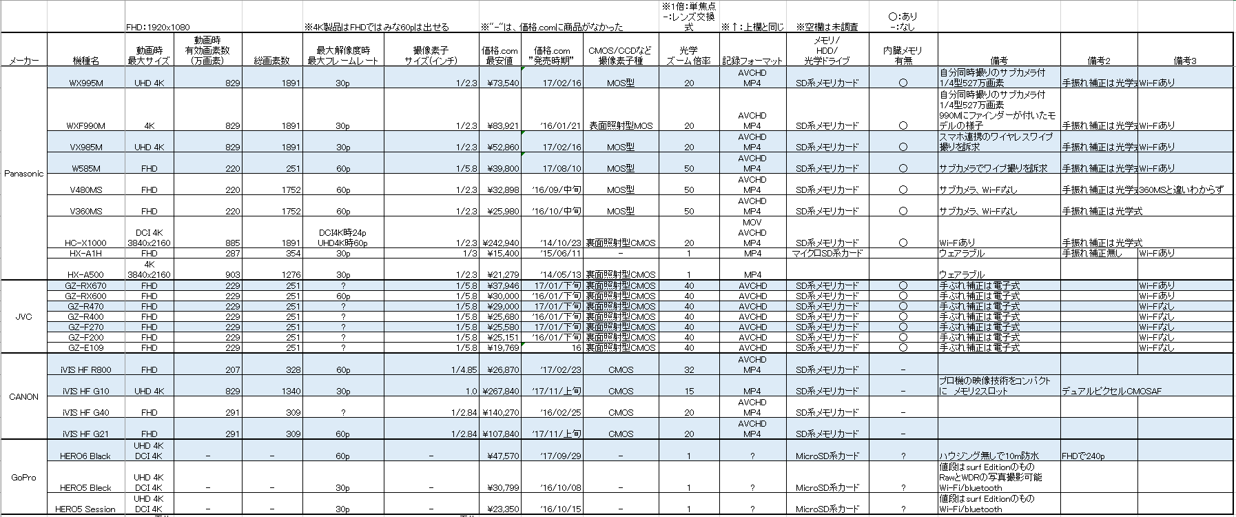 調査(?)対象メーカーは上表の通りソニー / パナソニック / JVC / キヤノン / GoPro (Woodman Labs)