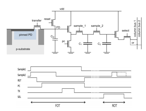まずは特徴的なのはグローバルシャッタ用に”C1”、”C2”と、画素内に”二つ”サンプリング用の容量を持っている点だと思います。