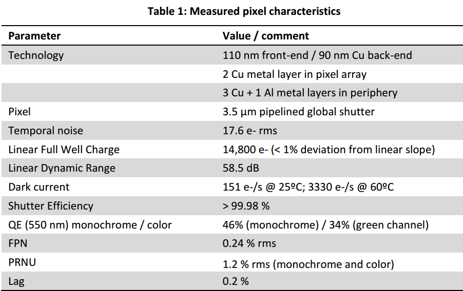 だとすると、このCMOSISのグローバルシャッタセンサの画素レイアウトで問題になるかもしれないのは、周辺減光、F値依存性、飽和などでしょうか。(この画素レイアウト、フォトダイオードは配線領域の下にも広がっているのでしょうか?まあどちらにしても、そもそもの用途が一般写真用のカメラで無ければ、上記特性で問題にならない項目もありそうですが)