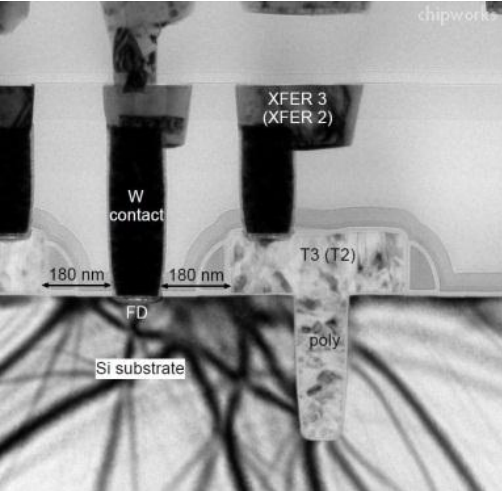 ”縦型転送ゲートは一体何がいいんだ?これで転送がしやすくなるというのであれば、(チャネルの形成方向は水平のまま)きっと深さ方向にもチャネル領域を広げたに違いない。であれば転送路をゲートがフォークの様に挟んだ構造なのか?”