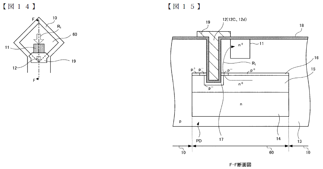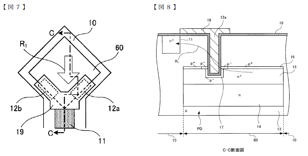 いずれもR1で示されたラインに沿って、ゲート電圧を正に印加すると埋め込まれたPD(n+領域15)からFD領域(n+領域11)への転送チャネルが形成され電荷転送が行われると。