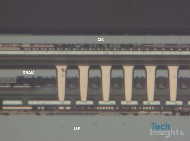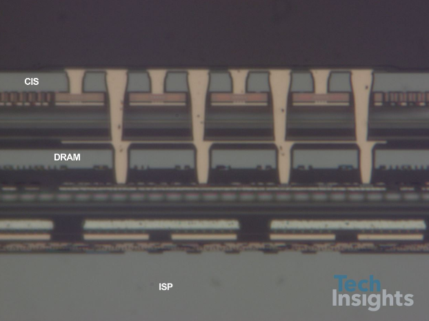 ・CIS(CMOS Image Sensor)とDRAMチップはFace to backで、DRAMチップとISP(Image Signal Processor)はFace to Faceで積層されていた