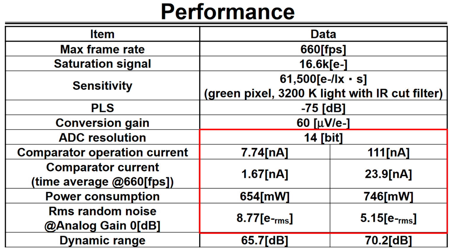 フレームレート660fpsは、画素数146万画素であれば、例え14bit分解能であったとしても、ソニーさんとしては特に驚く様なスペックでは無い感じでしょうか。