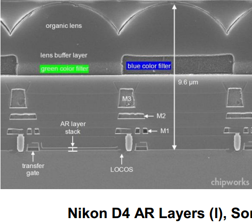 最後に3)ですが、「どこかで見たことあるぞ」と思ったら、ルネサス製造Nikon D4搭載センサでも同様の(Green画素上にのみ反射防止膜が存在する)構造(←最後の写真)でした。