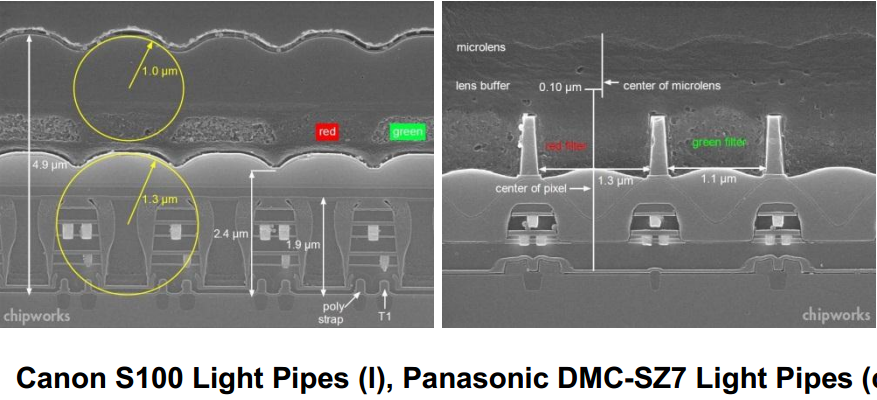 良く見直したら、chipworksの写真の下の文字も、パナソニックとキヤノンは”light pipe”となっていますが、サムスンのは”Cavity Fill”となっていますね。
