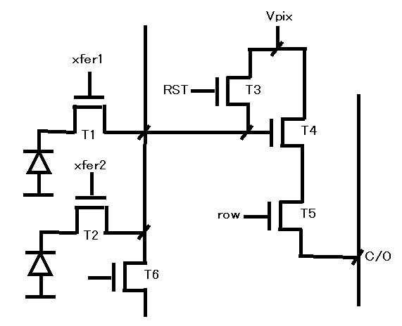 つまり、縦2画素共有の行選択スイッチありの画素なのですが、一つトランジ