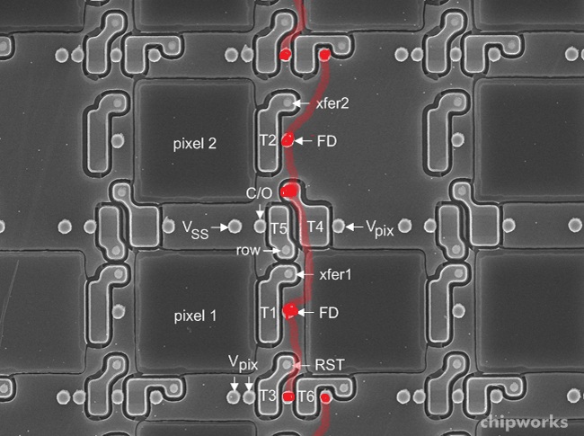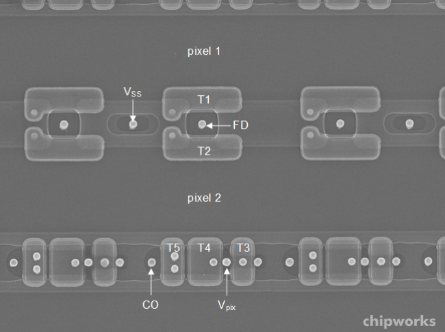 先にD4センサのものと比べると違いがわかりやすいですが、このセンサ、4.7um□という一眼レフ用としては小さい画素ピッチでも高感度/ダイナミックレンジを確保するために、画素の横方向の素子分離が存在しないように見えます(上下方向はトランジスタが存在するために素子分離がある)。