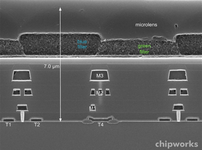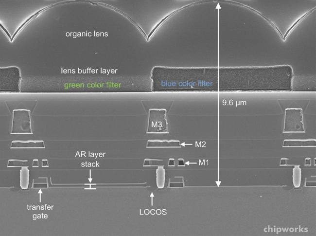 後は、M2とM3の層間膜厚がやたらと薄そうですが、これは恐らく画素部の光学特性(集光性能。特に斜め光)を考慮して、光線蹴られを少しでもなくすために低背化を行ったためと予想します。